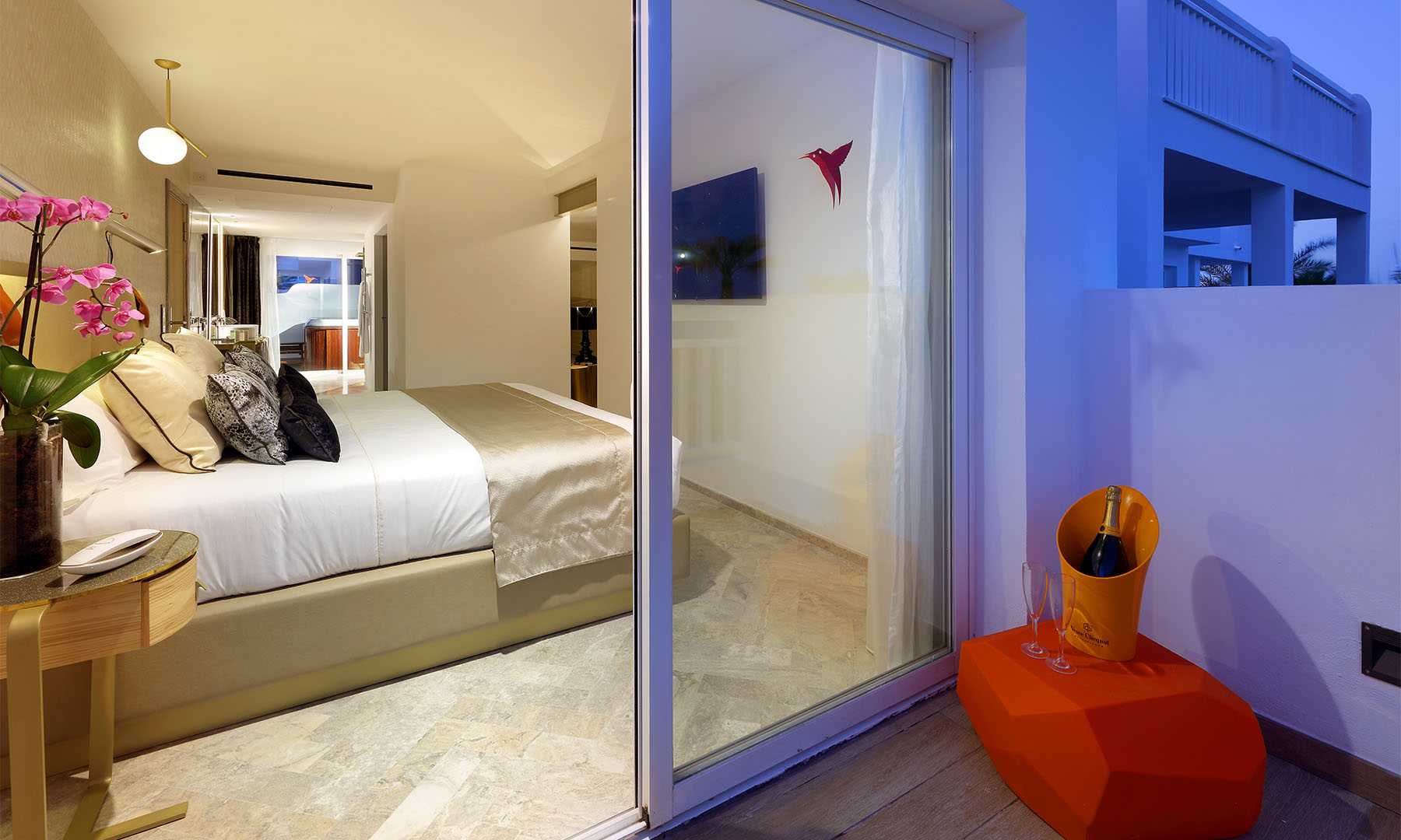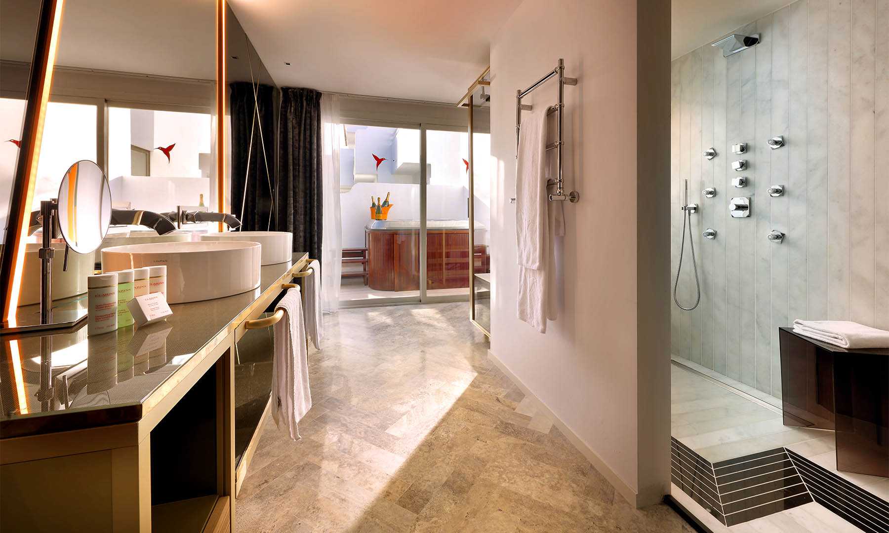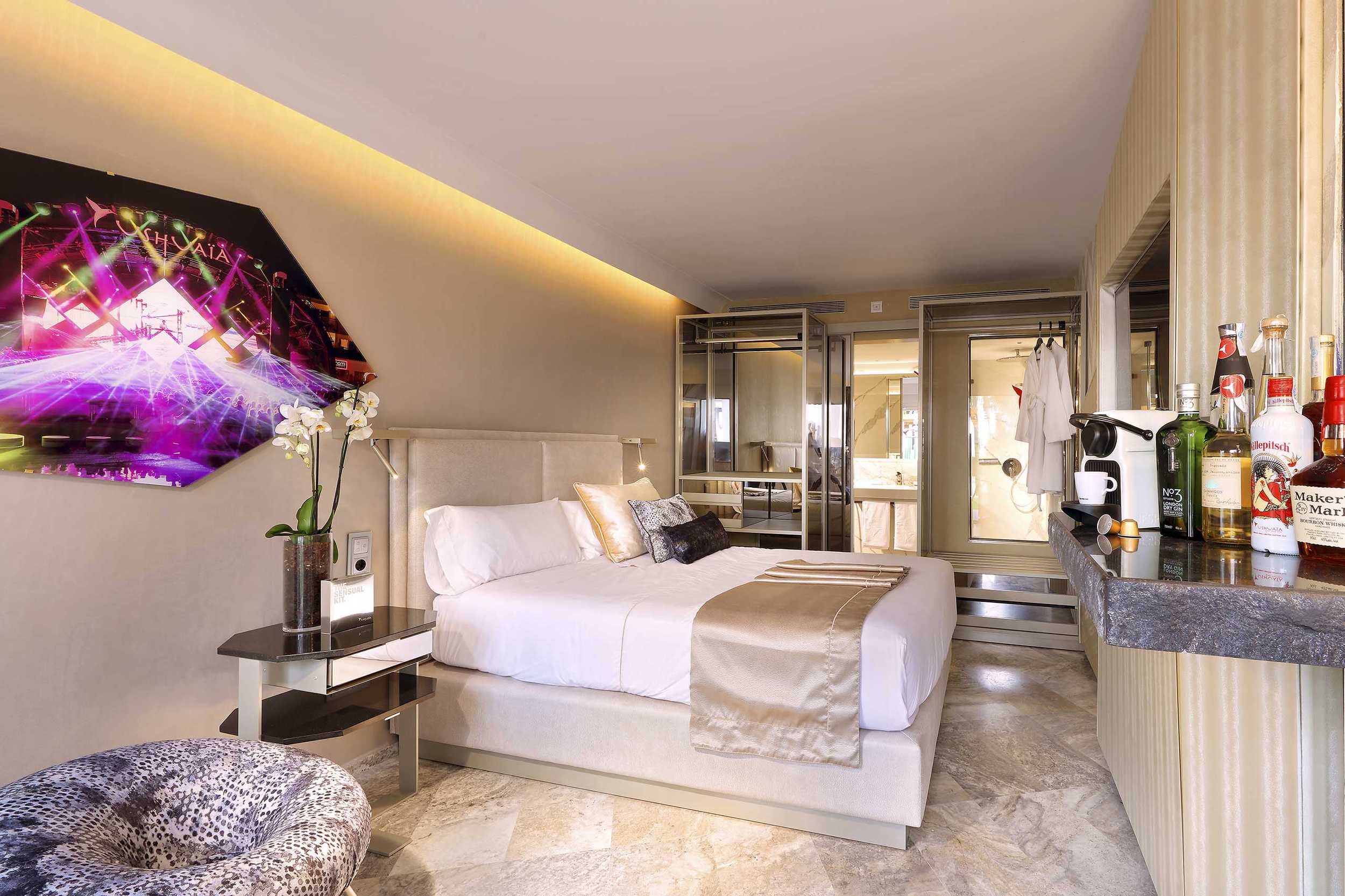 Caprichos. Deseos. Apetitos. La felicidad a veces es muy sencilla. Basta con satisfacer los impulsos. Escaparse a la playa en mitad de la noche y hundir los pies en la arena. Abrir el kit erótico. Y usarlo. Renacer en la bañera de hidromasaje de la terraza. Bajo las estrellas. O a pleno sol. La exclusiva Suite Ay Caramba, situada en la primera planta, cuenta con tres terrazas y nada escapa a la vista desde ellas. Sólo es cuestión de decidirse… Puro antojo. Y con todos los detalles que la convierten en una exclusiva suite de lujo al más puro estilo Ushuaïa Ibiza.